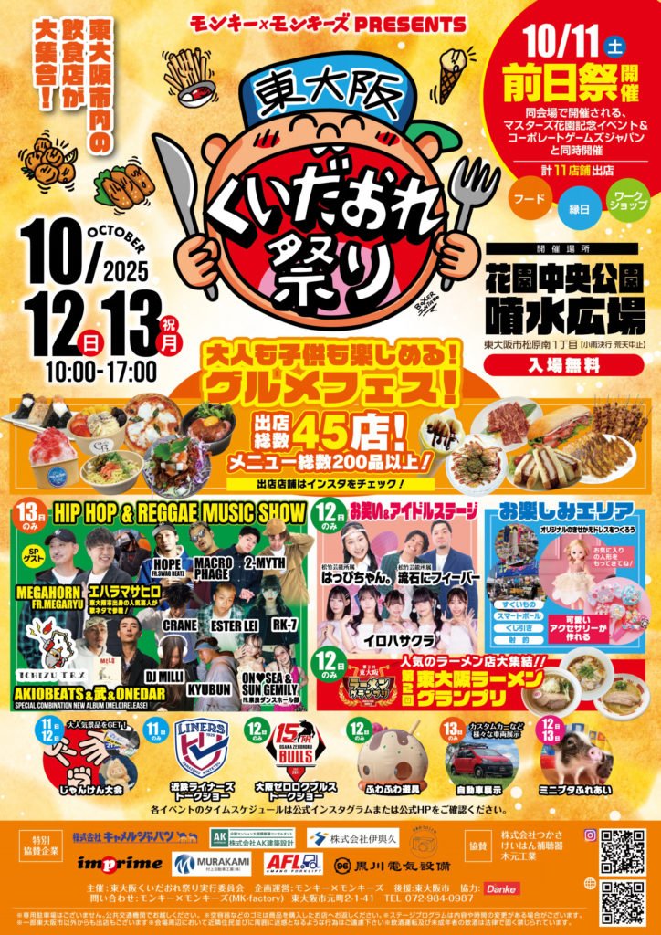 日頃は花園近鉄ライナーズへご声援を賜り誠にありがとうございます。2025年10月11日(土)、花園中央公園噴水広場にて開催の「東大阪くいだおれ祭り」にライナーズが出演します。ぜひお越しください。