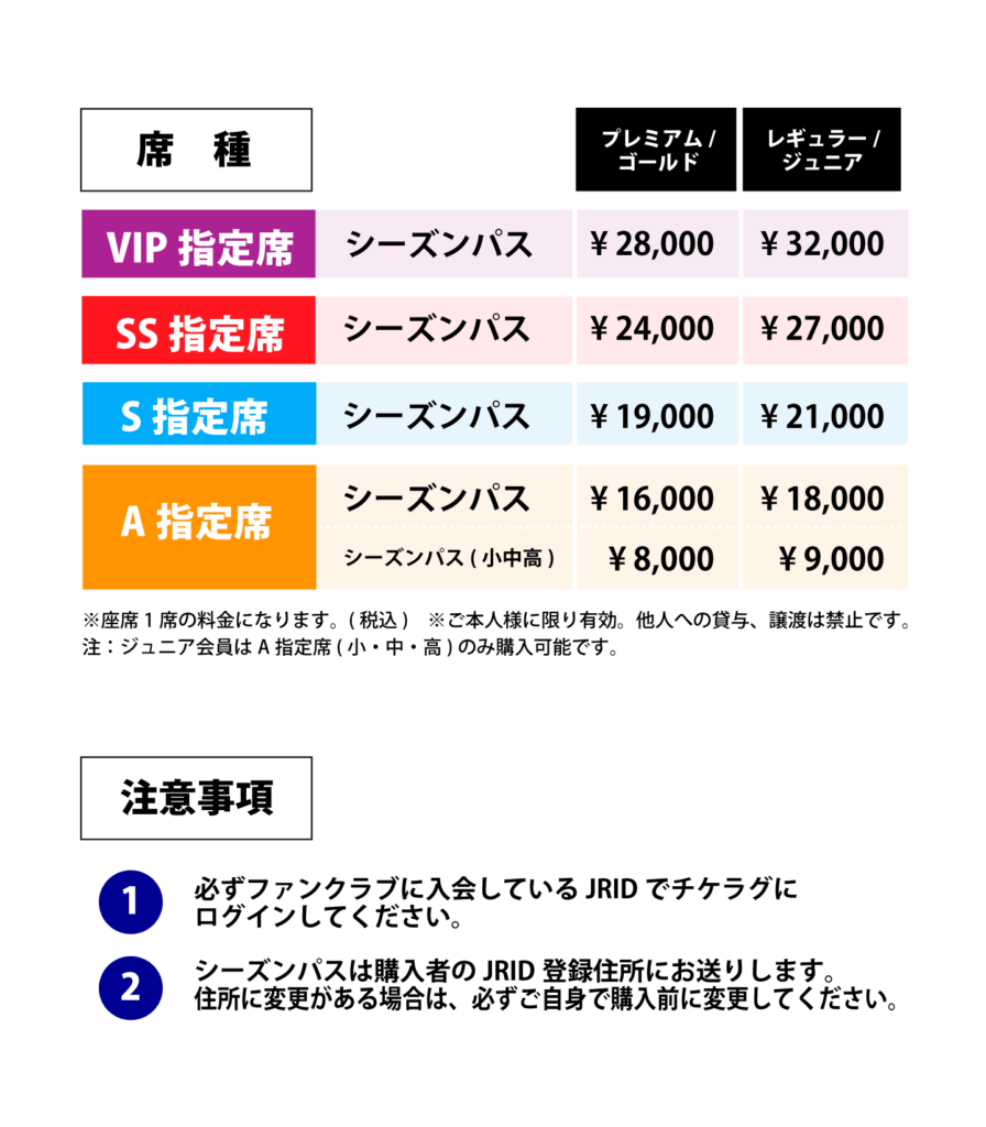 なお、シーズンパス購入はファンクラブ会員様のみとなります。お求めの方はファンクラブへのご入会をよろしくお願いいたします。
